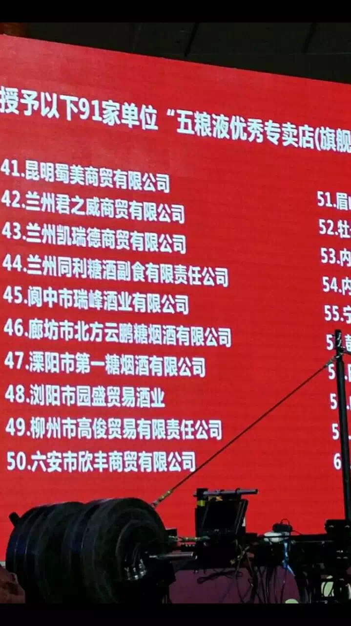 会上,五粮液总结了2015年所获得的成绩和发布了2016年工作目标。公布和表彰了五粮液杰出品牌运、模范品牌运营商、优秀品牌运营商、模范专卖(旗舰)店、优秀经销商、优秀专卖(旗舰)店及优秀团购拓展奖等多项奖励。溧阳市第一糖烟酒有限公司荣获全国五粮液优秀专卖店。